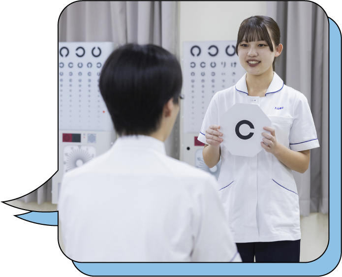 - 臨地実習で患者様に対して視力検査を担当させていただいたのですが、普段よりも時間が掛かっているにもかかわらず「ありがとう」「頑張ってね」という言葉を掛けてくださり、とても嬉しかったことが心に残っています。